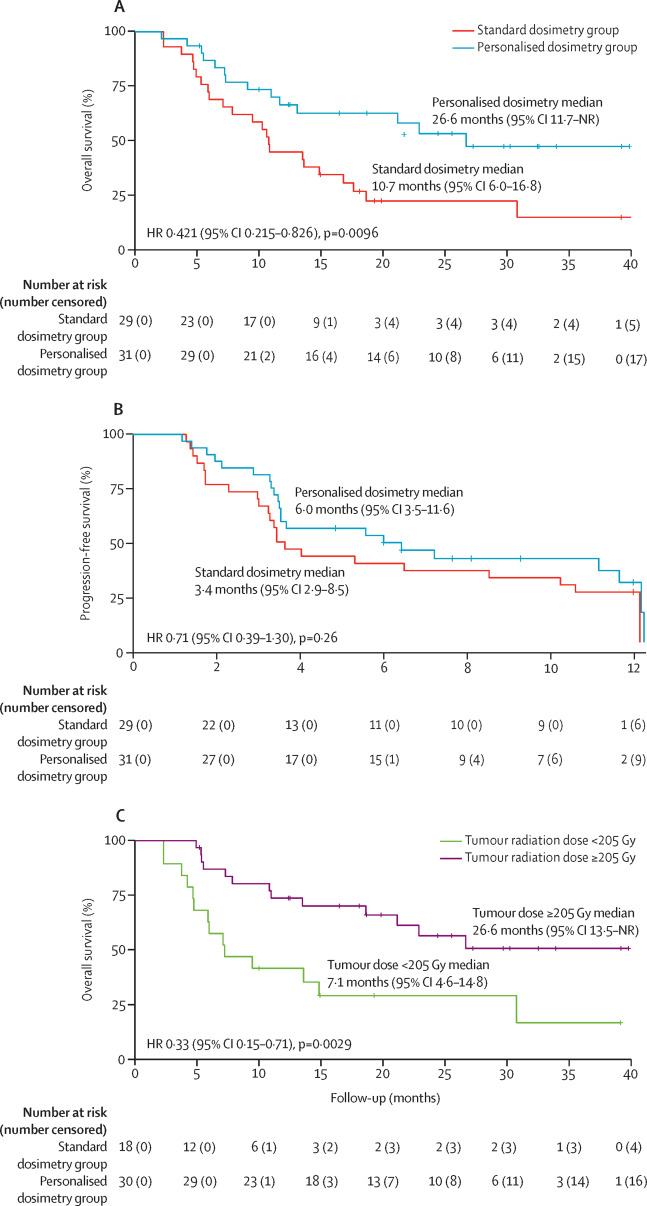 Personalized dosimetry showed higher median overall survival (26.6 months for vs. 10.7 months)