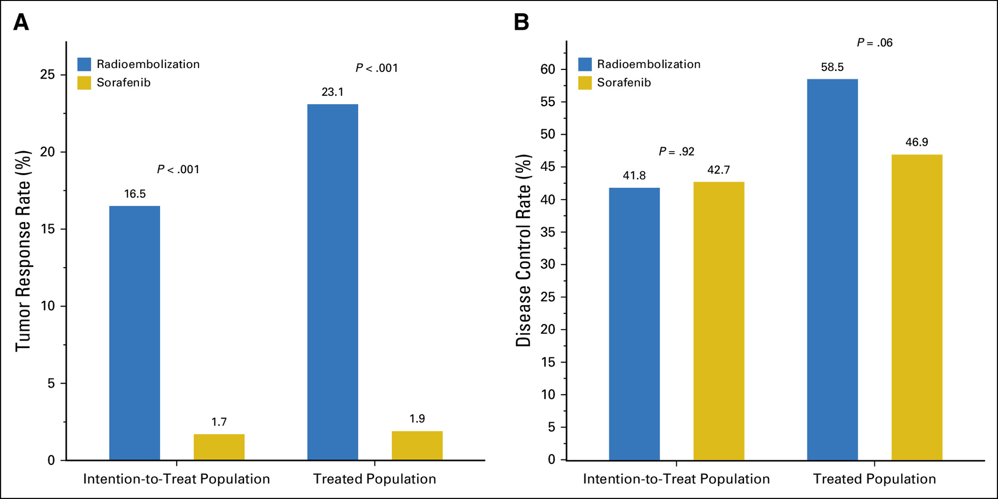 Radioembolization showed significantly fewer grade 3 adverse fewer adverse events (27.7% vs. 50.6%)